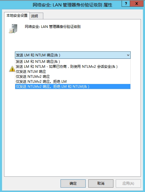 仅发送 NTLMv2 响应。拒绝 LM & NTLM:客户端仅使用 NTLMv2 身份验证,并且在服务器支持时使用 NTLMv2 会话安全;域控制器拒绝 LM 和 NTLM (仅接受 NTLMv2 身份验证)